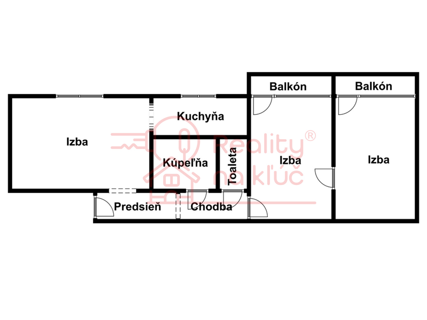 Byt pozostáva z predsiene, chodby, samostatnej toalety, kúpeľne, dvoch samostatných izieb s výstupom na balkón, obývacej izby a kuchyne.